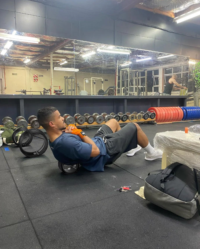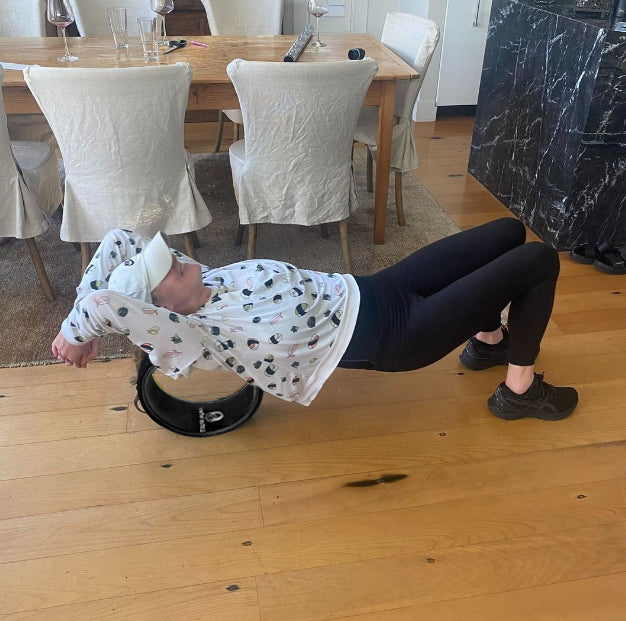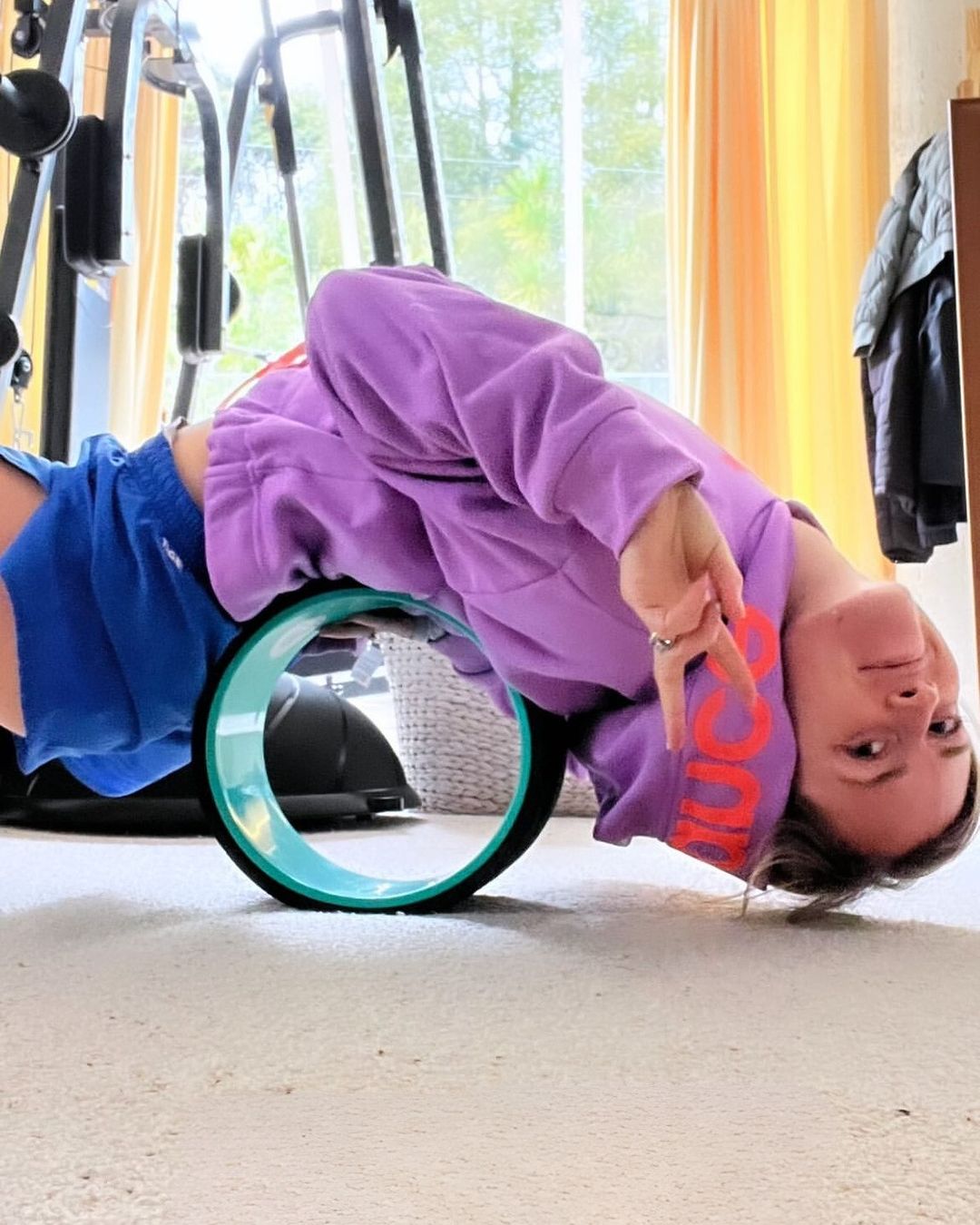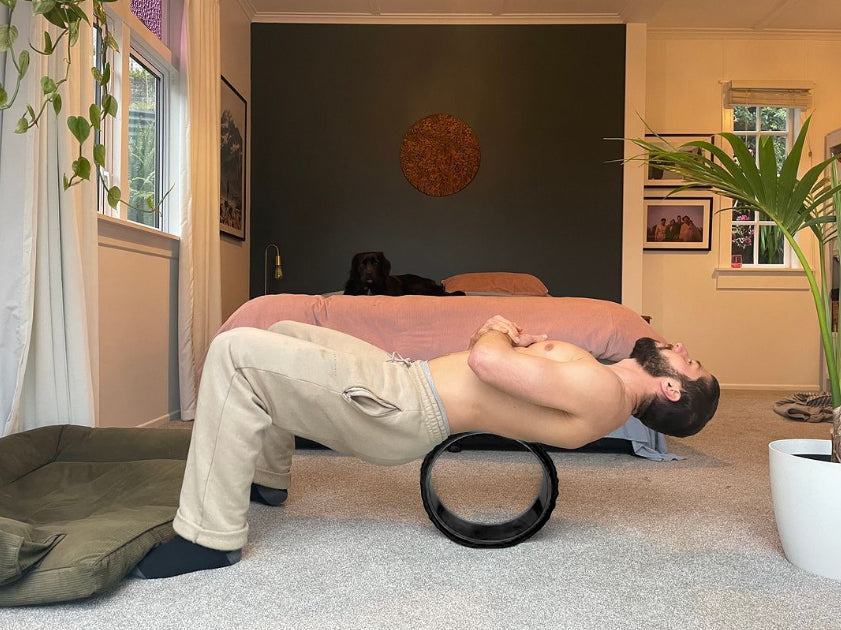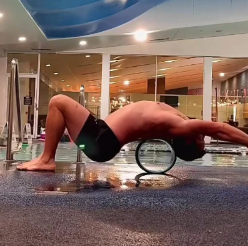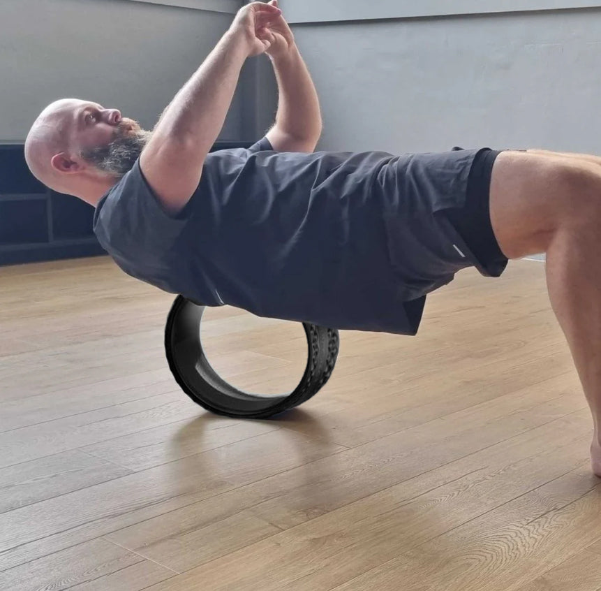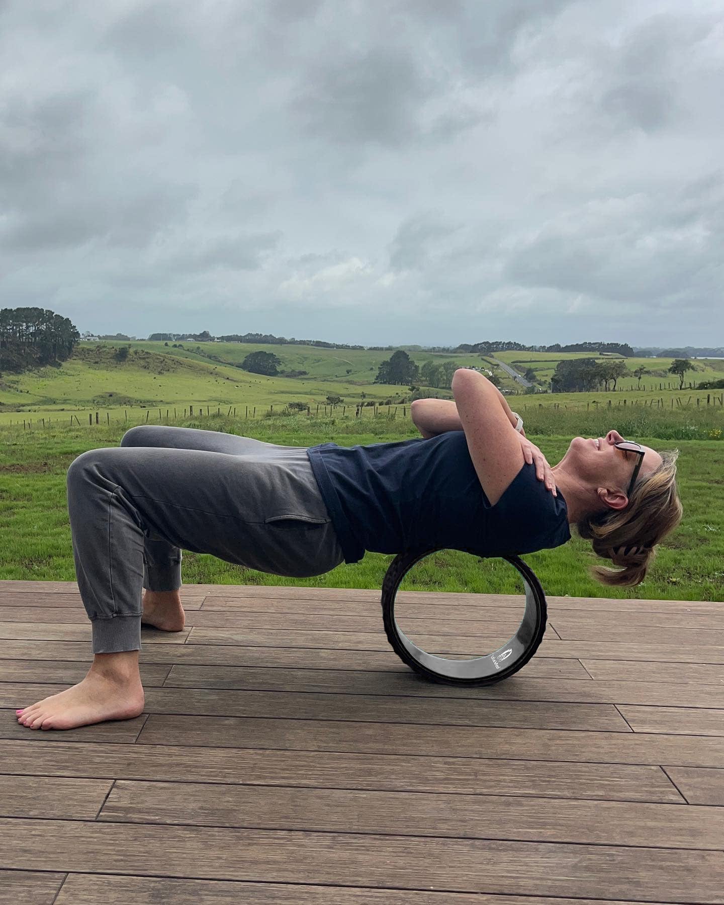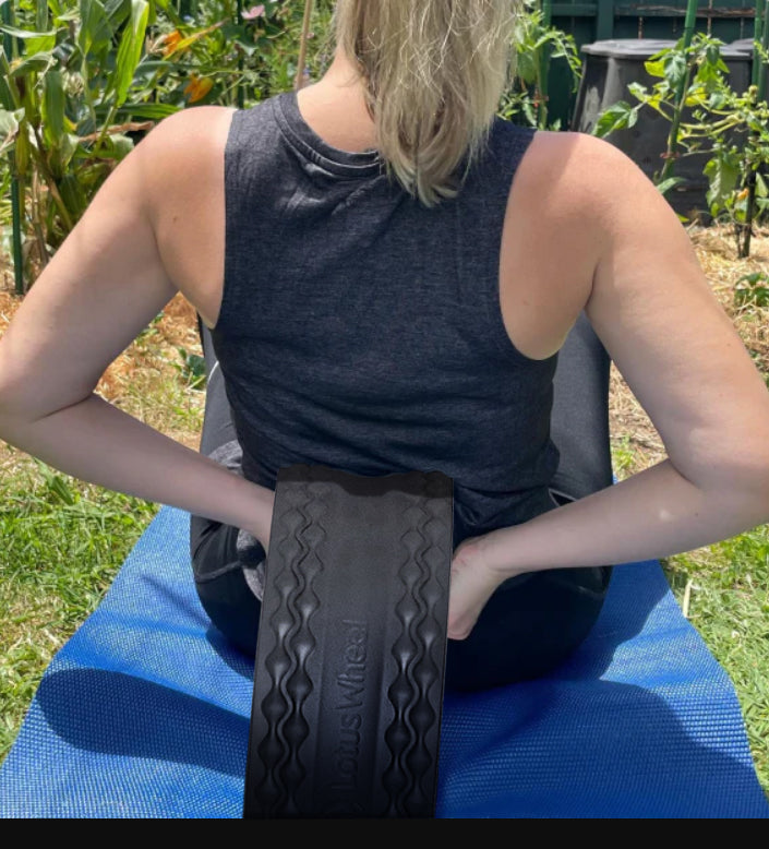 To use the Lotus Wheel for your back, place the 33cm, 27cm or 17cm wheel place the wheel on the floor and slowly lean back onto it. Gently roll along your upper and mid-back area. This is a great way to stretch out, ease into movement, and create space through the upper body.